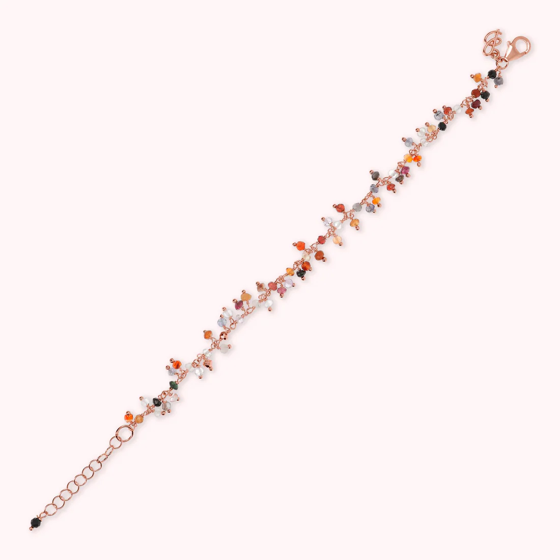 Bracciale Bronzallure realizzato in lega Golden Rosé, placcato oro rosa 18kt, impreziosito da piccoli ciondoli in quarzo multicolore; chiusura a moschettone con extender.