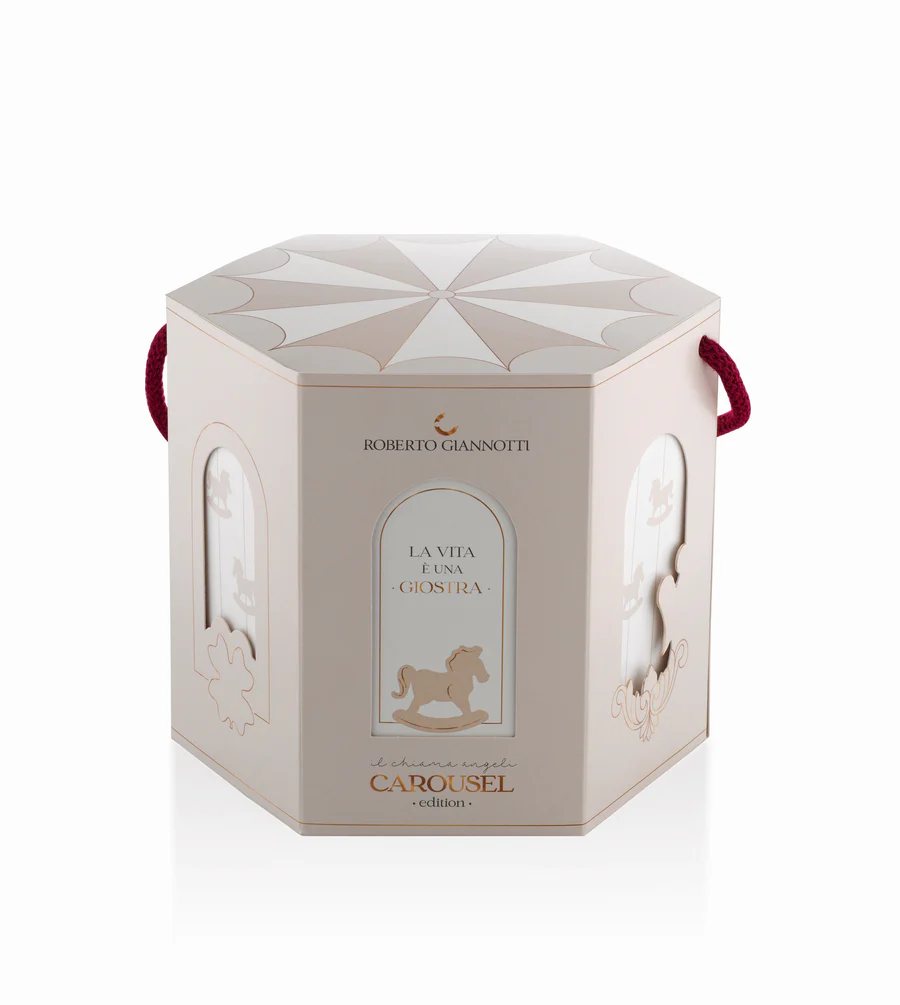 Grazie a un sofisticato meccanismo, i cavalli al suo interno ruotano come in una vera giostra, aggiungendo un tocco di magia al design! Immancabile è il dolce tintinnio che caratterizza tutti i Chiama Angeli di Roberto Giannotti.
