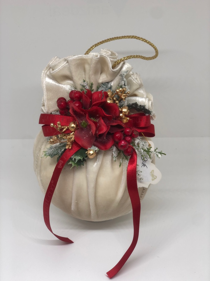Decoro natalizio a forma di palla in velluto bianco Fiori di Lena con fiore rosso.